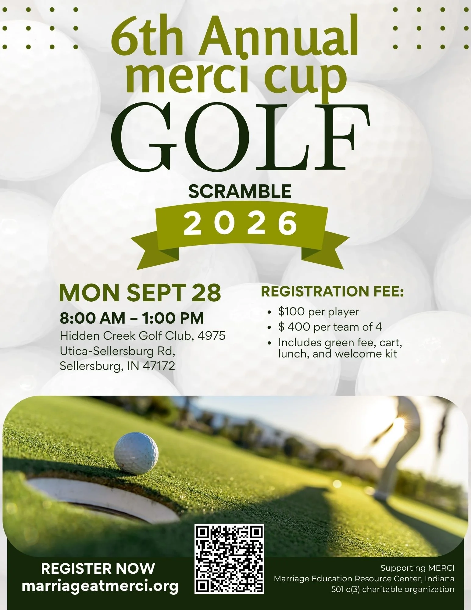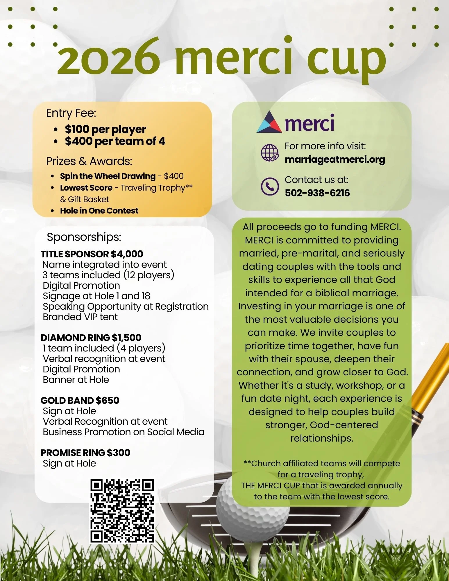The MERCI CUP is a four‑person team scramble. Cost: $400 per team. Church‑affiliated teams will compete for the annual traveling trophy, THE MERCI CUP.